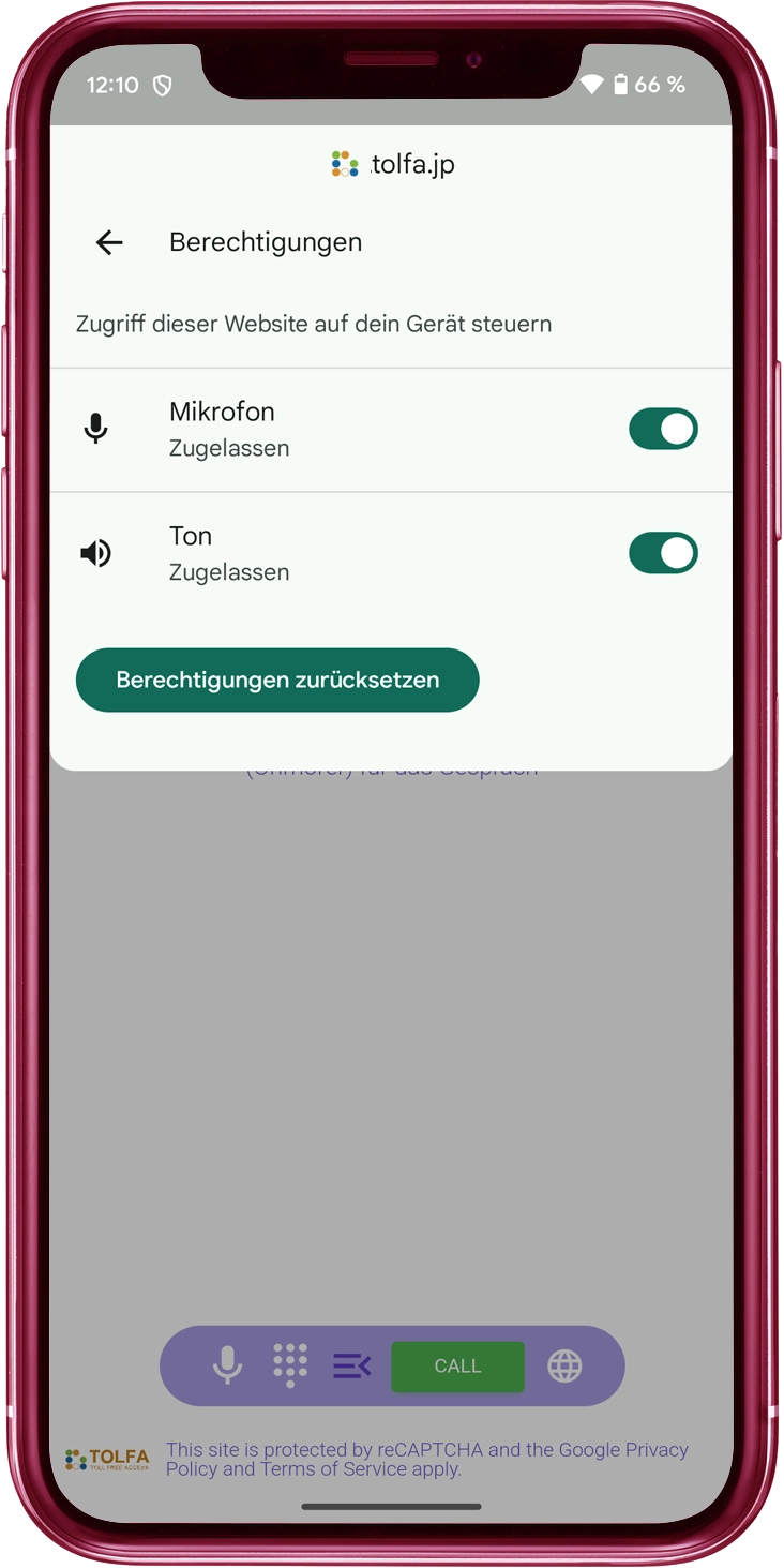 Schalten Sie den "Mikrofon"-Schalter auf EIN. Überprüfen Sie, ob die Website "tolfa.jp" in einer Liste mit der Bezeichnung "Erlaubt" enthalten ist.