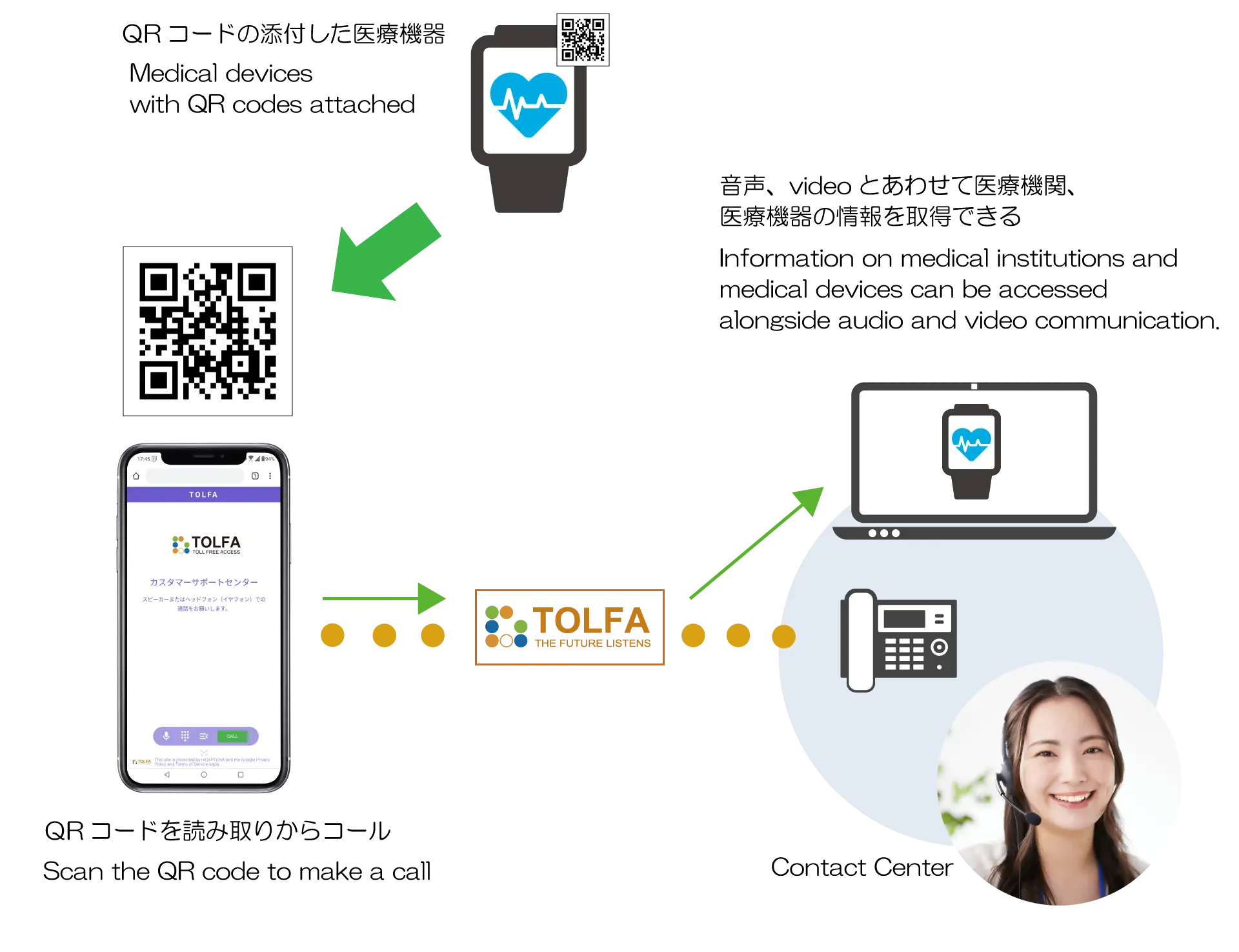 Each QR code placed on a medical device can include details about the device, the medical facility, and where the call should go. After scanning the QR code, the customer can start a call to the intended destination with a single tap. When an agent answers, the agent can immediately see the passed details on their screen. Agents can review this information through their existing CTI or CRM screens. Video calls are also available, allowing agents to view the device while speaking with the customer.