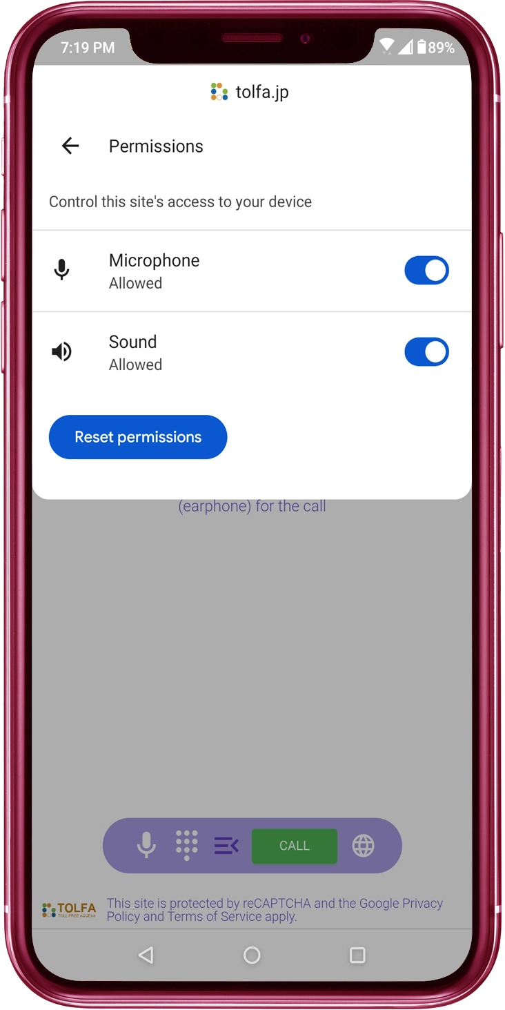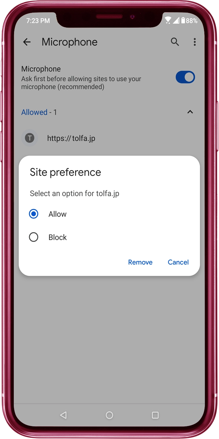 If microphone access is currently not permitted, you should locate the website "tolfa.jp" in a list and then enable microphone access for it.