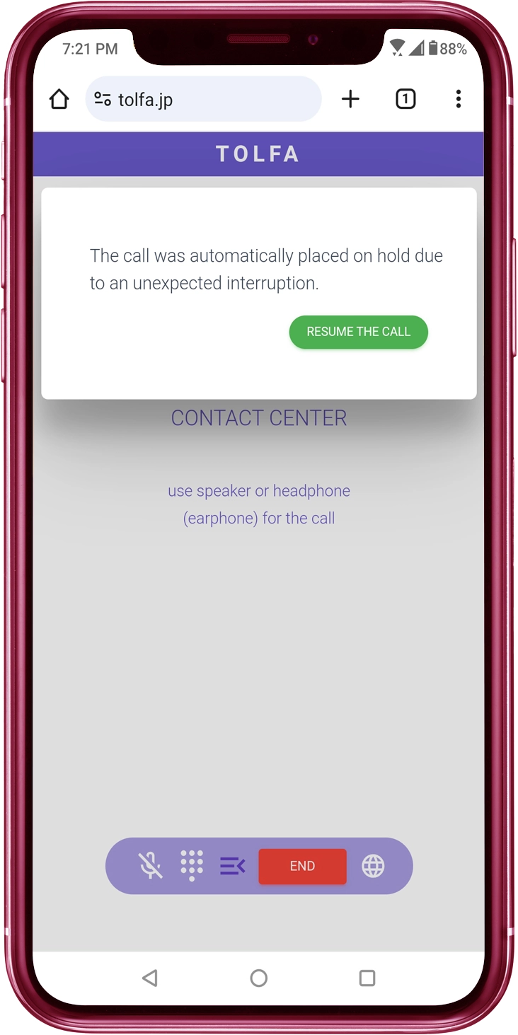TOLFA automatically places the call on hold to prevent disconnection even if audio transmission and reception are blocked (TOLFA provide guidance indicating that the call has been placed on hold). When you bring the browser to the foreground to remove the hold, you can resume the conversation with the contact center agent you were speaking to previously.