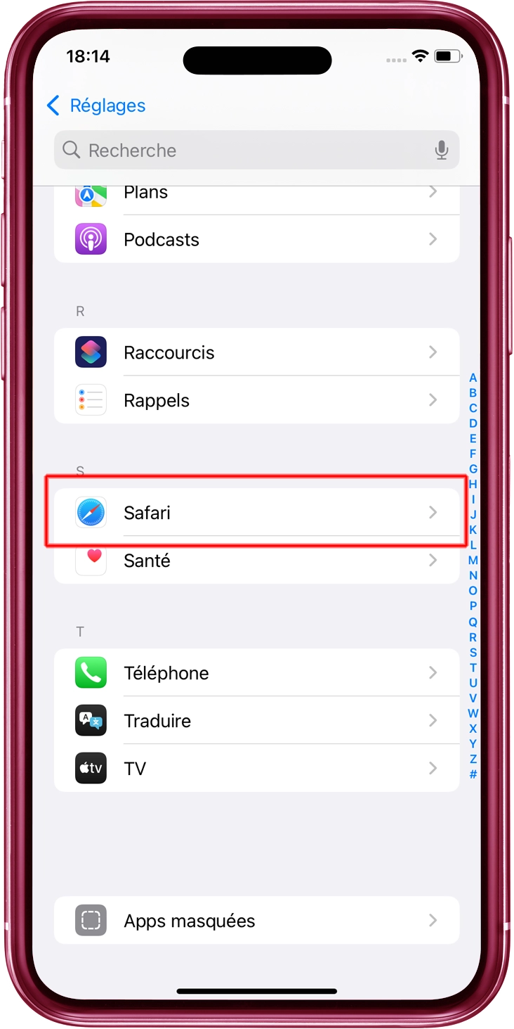 Ouvrez "Applications" depuis "Réglages", puis appuyez sur "Safari".