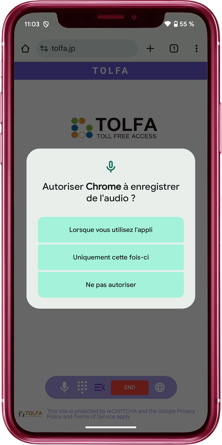 TOLFA est un service exclusivement dédié aux appels sortants, conçu pour connecter les utilisateurs à des voicebots d’IA ou à des centres de contact. Les appels étant effectués via un navigateur web, le numéro affiché n’est pas celui du smartphone, mais un numéro unique attribué par le système.