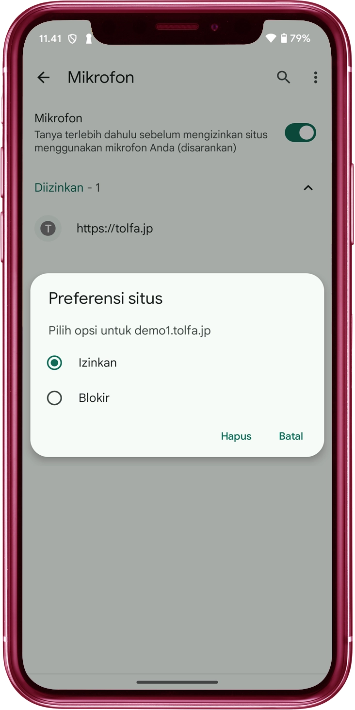 Geser sakelar "Mikrofon" ke posisi ON. Periksa apakah situs web "tolfa.jp" ada dalam daftar yang diberi label "Diizinkan"