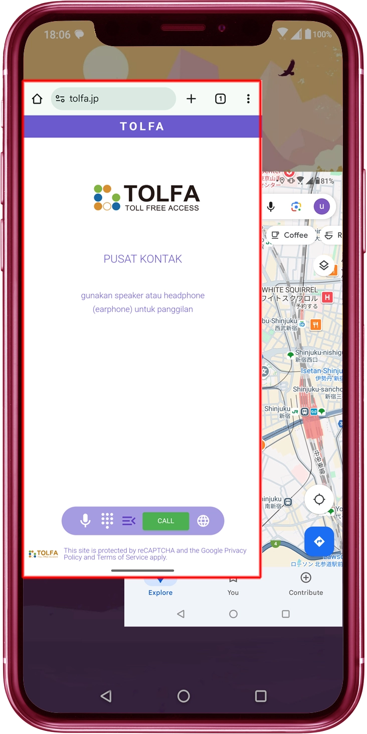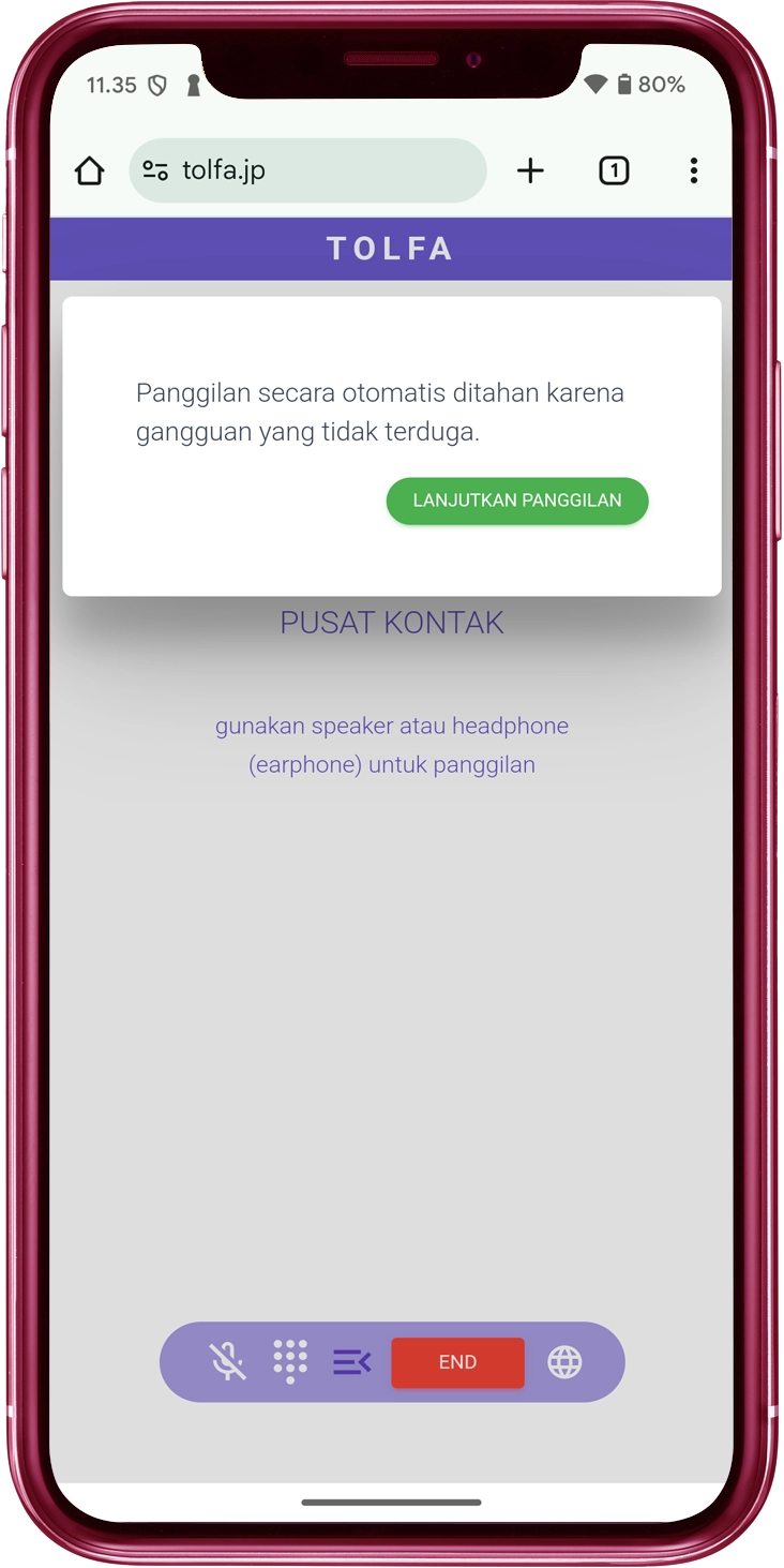 Saat Anda mengetuk tombol pertanyaan di situs web atau memindai kode QR, antarmuka pengguna TOLFA untuk melakukan panggilan akan muncul.