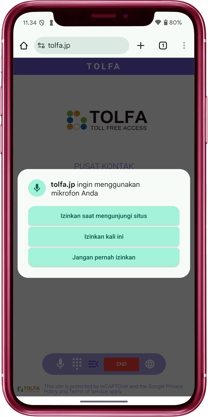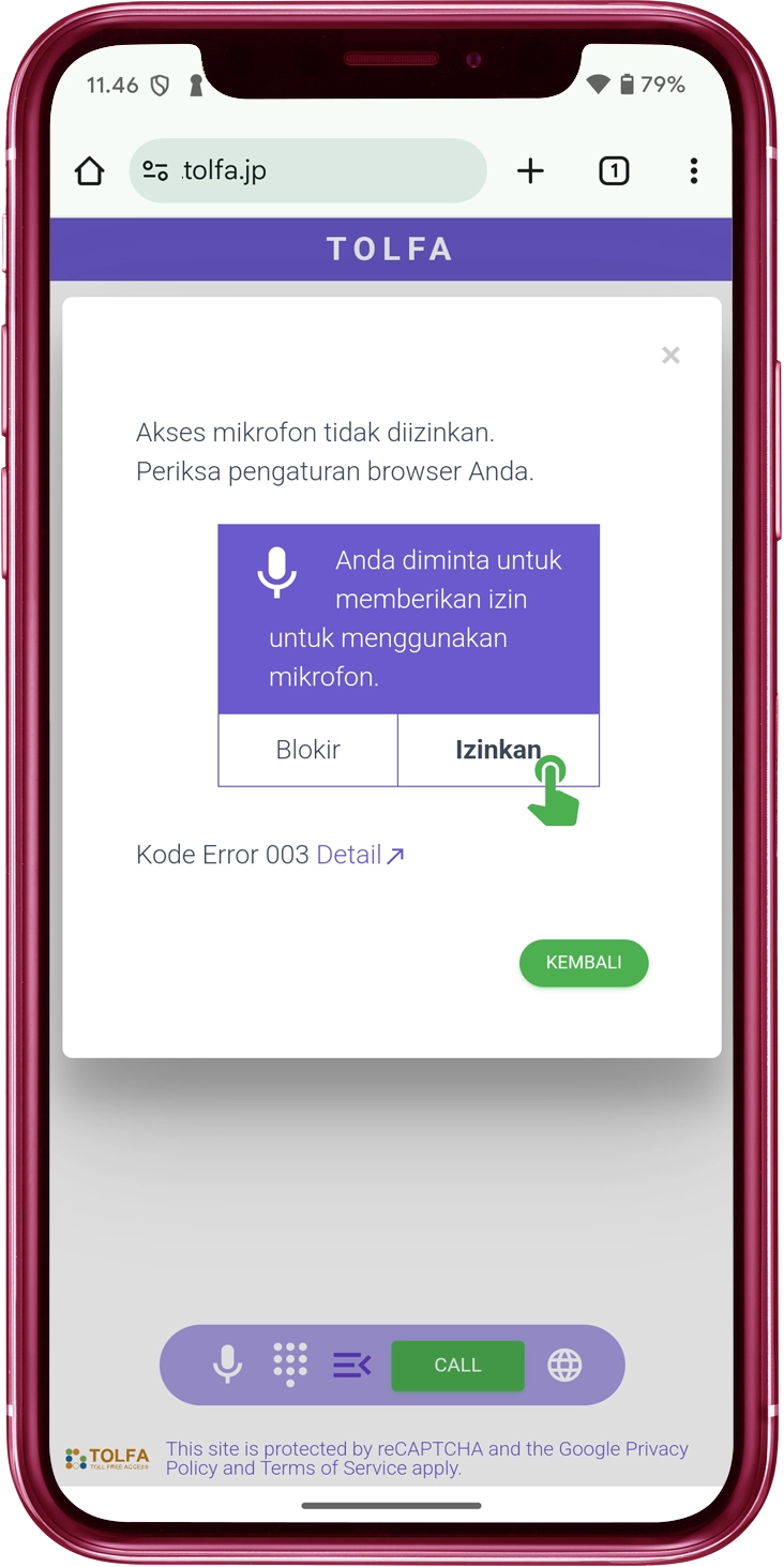 Setelah mengetuk tombol PANGGIL, jika muncul dialog yang meminta izin untuk menggunakan mikrofon di browser, harap ketuk 'Izinkan'. Jika akses mikrofon tidak diizinkan di browser, Anda tidak akan bisa melakukan panggilan karena mikrofon yang diperlukan untuk panggilan tidak akan tersedia.