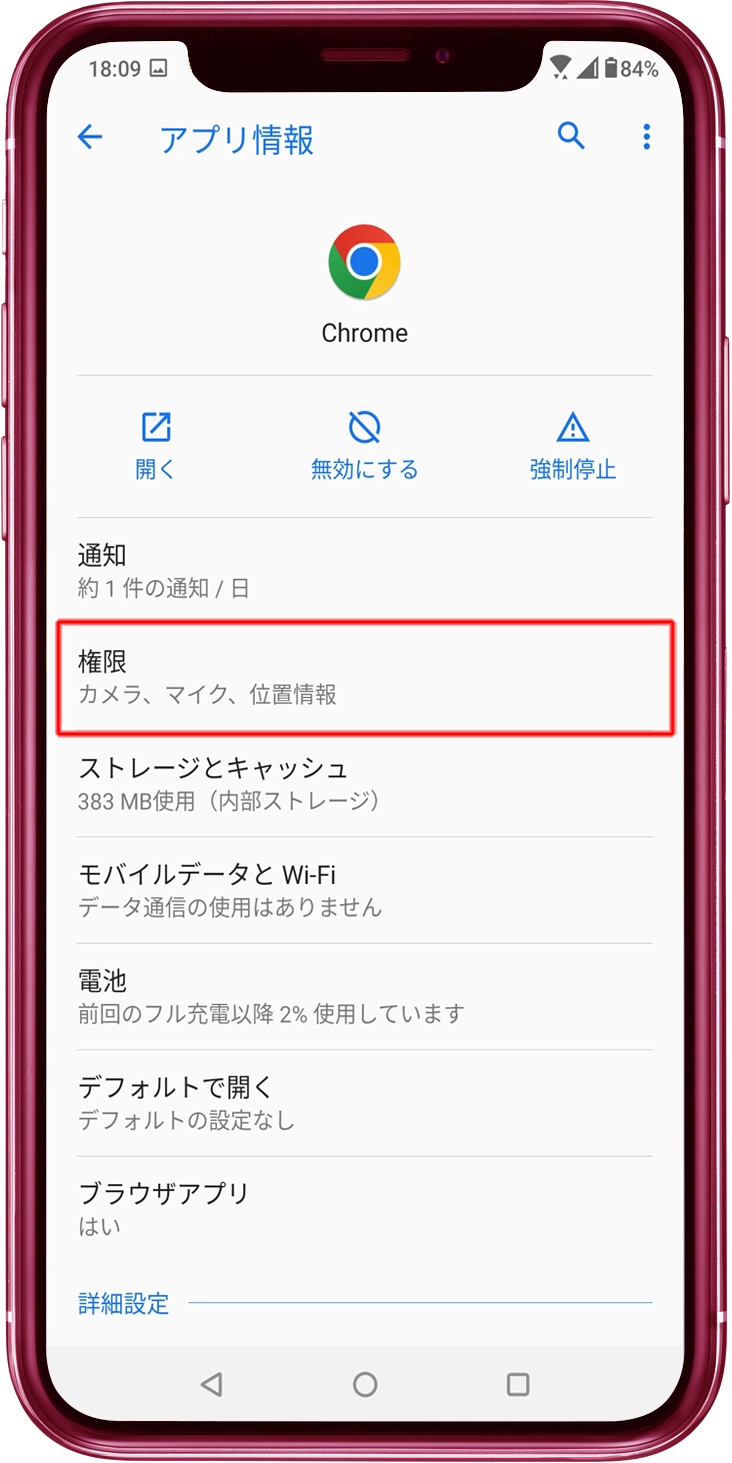 「アプリ情報」画面で、「権限(カメラ、マイク)」をタップします。