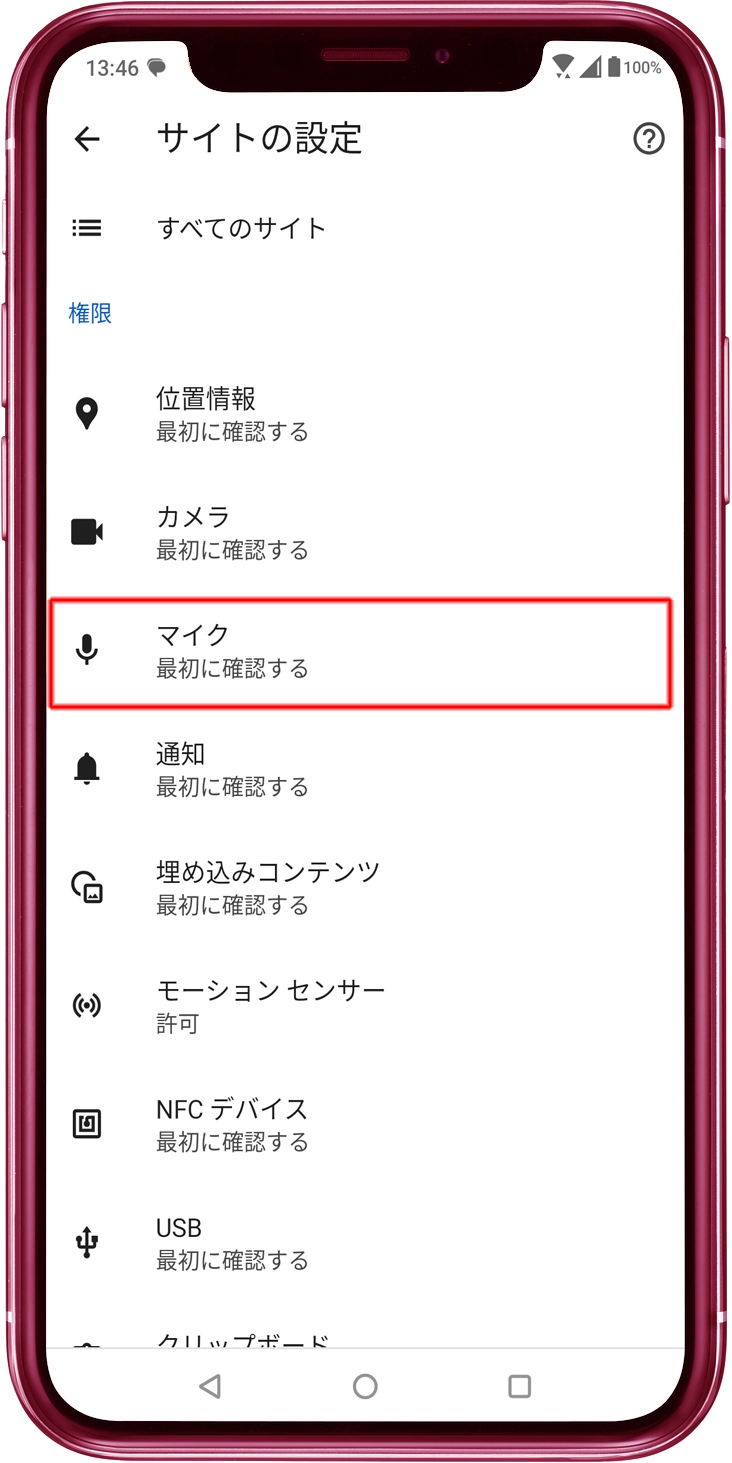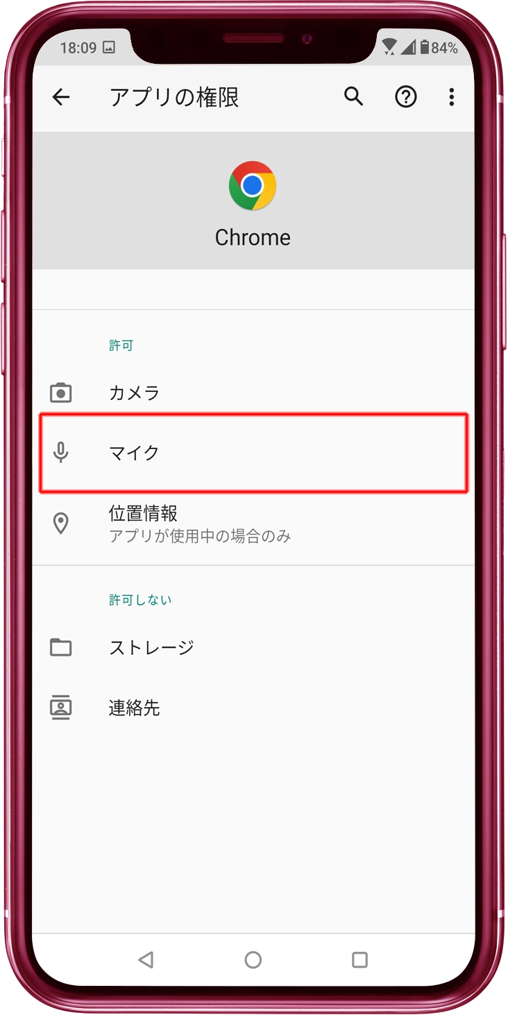 「アプリの権限」画面で、「マイク」をタップします。