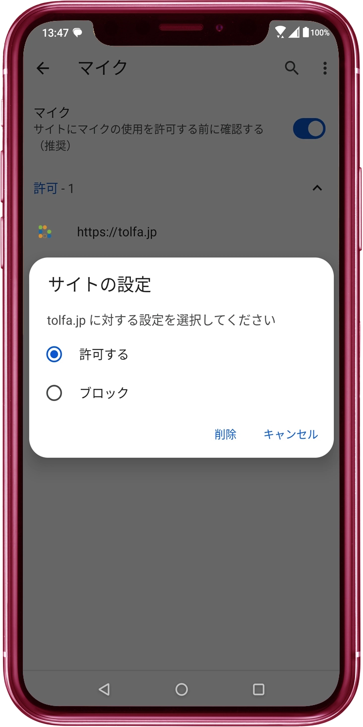tolfa.jpがマイク利用許可をされていない場合は、リストのtolfa.jpをタップし、マイクの「許可」をONにします。