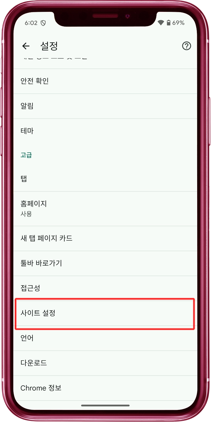 메뉴에서 "사이트 설정"을 탭하세요.
