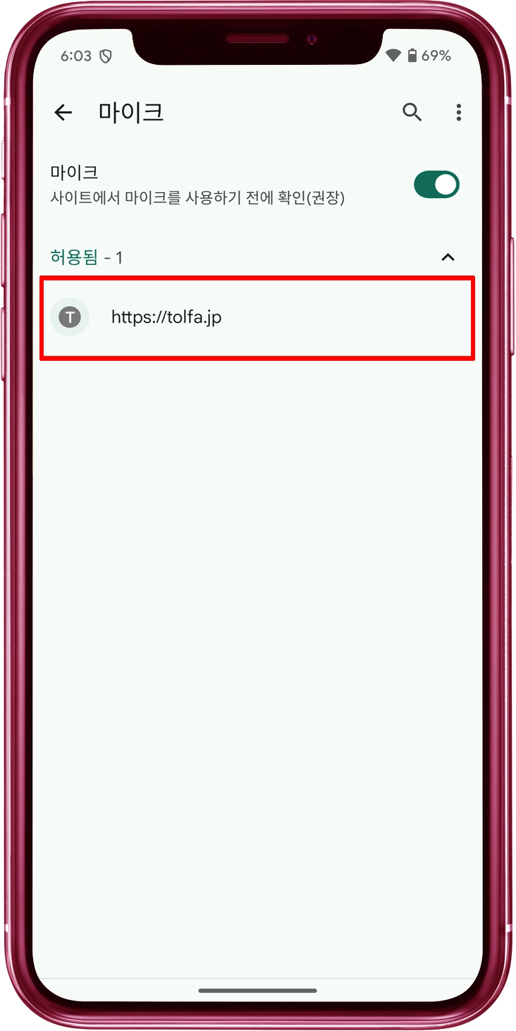 "마이크" 스위치를 켬으로 전환하세요. "tolfa.jp" 웹사이트가 "허용됨" 목록에 포함되어 있는지 확인하세요.