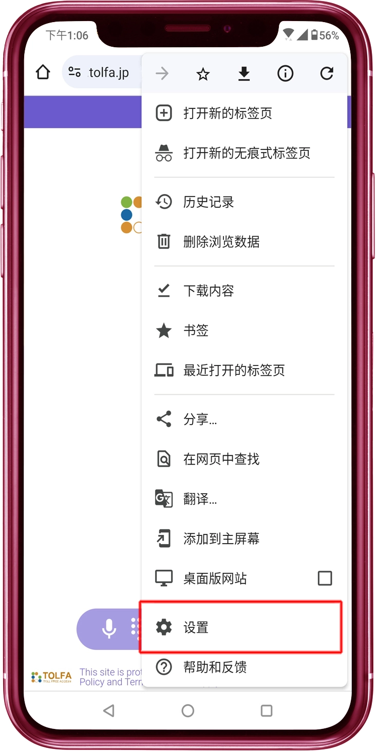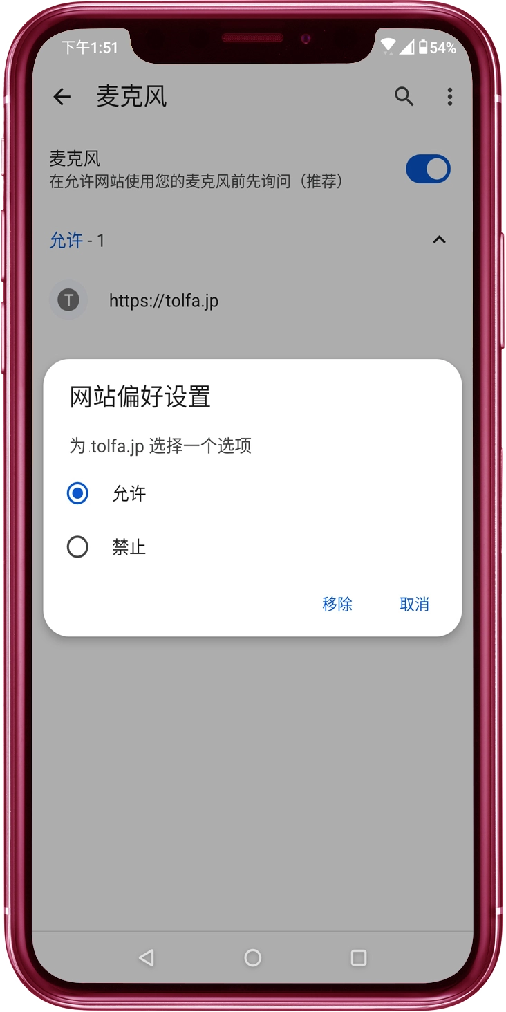 将“麦克风”开关切换为开启状态。确认网站“tolfa.jp”是否包含在标记为“允许”的列表中。