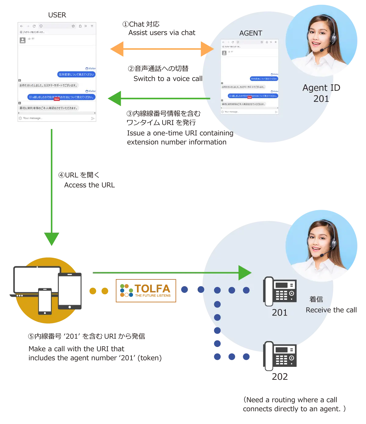 If an issue cannot be resolved through chat alone, switching to a voice call can help move the conversation forward. In the past, customers had to place a new phone call, re-enter the queue, and wait their turn again. With TOLFA, a customer can open a URL and place a call directly to the agent who handled the chat. This allows the conversation to continue right away, without starting over.