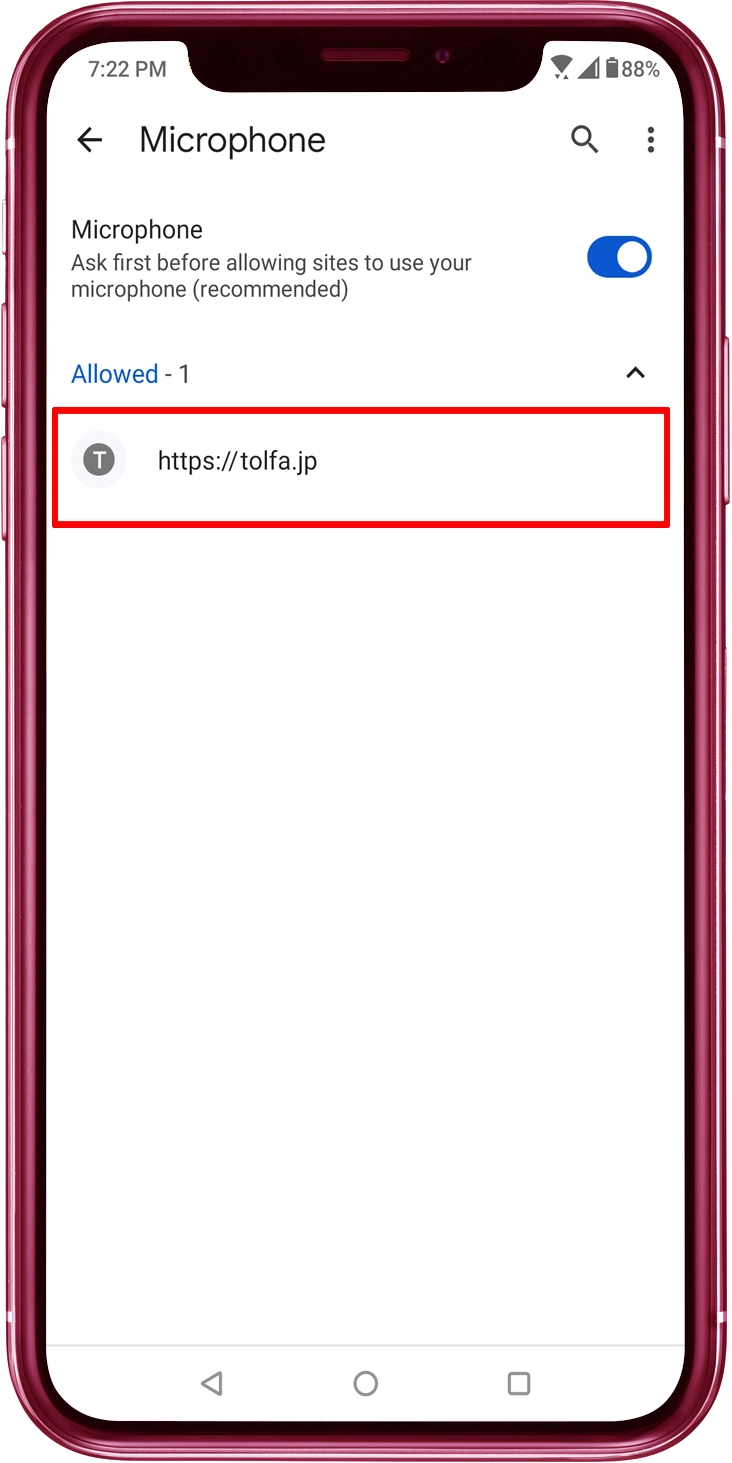 Toggle the "Microphone" switch to ON. Confirm whether the website "tolfa.jp" is included in a list labeled as "Allowed"