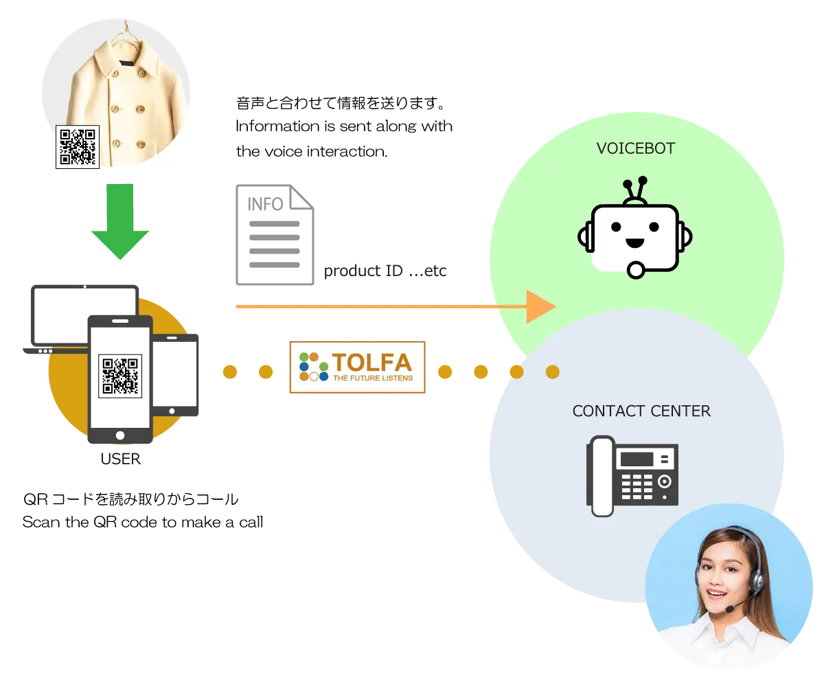 By calling through a QR code or URL that contains information, relevant details can be passed to the voicebot or PBX. When a QR code is placed on a product in advance, customers can scan it to call the appropriate support desk directly. At the moment the agent answers, they can immediately see which product the inquiry is about.