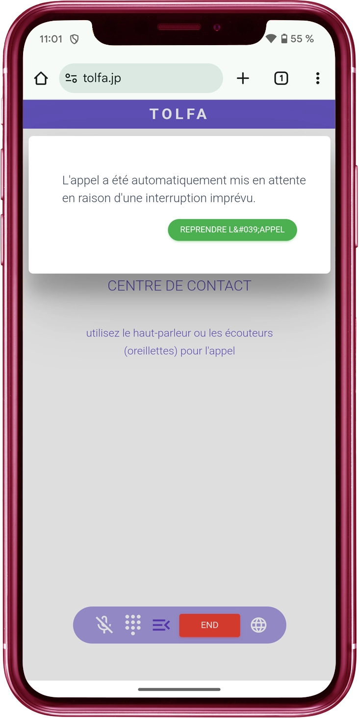 TOLFA place automatiquement l'appel en attente pour éviter la déconnexion, même si la transmission et la réception audio sont bloquées (TOLFA fournit un guide indiquant que l'appel a été mis en attente). Lorsque vous amenez le navigateur au premier plan pour enlever la mise en attente, vous pouvez reprendre la conversation avec l'agent du centre d'appel avec lequel vous parliez précédemment.