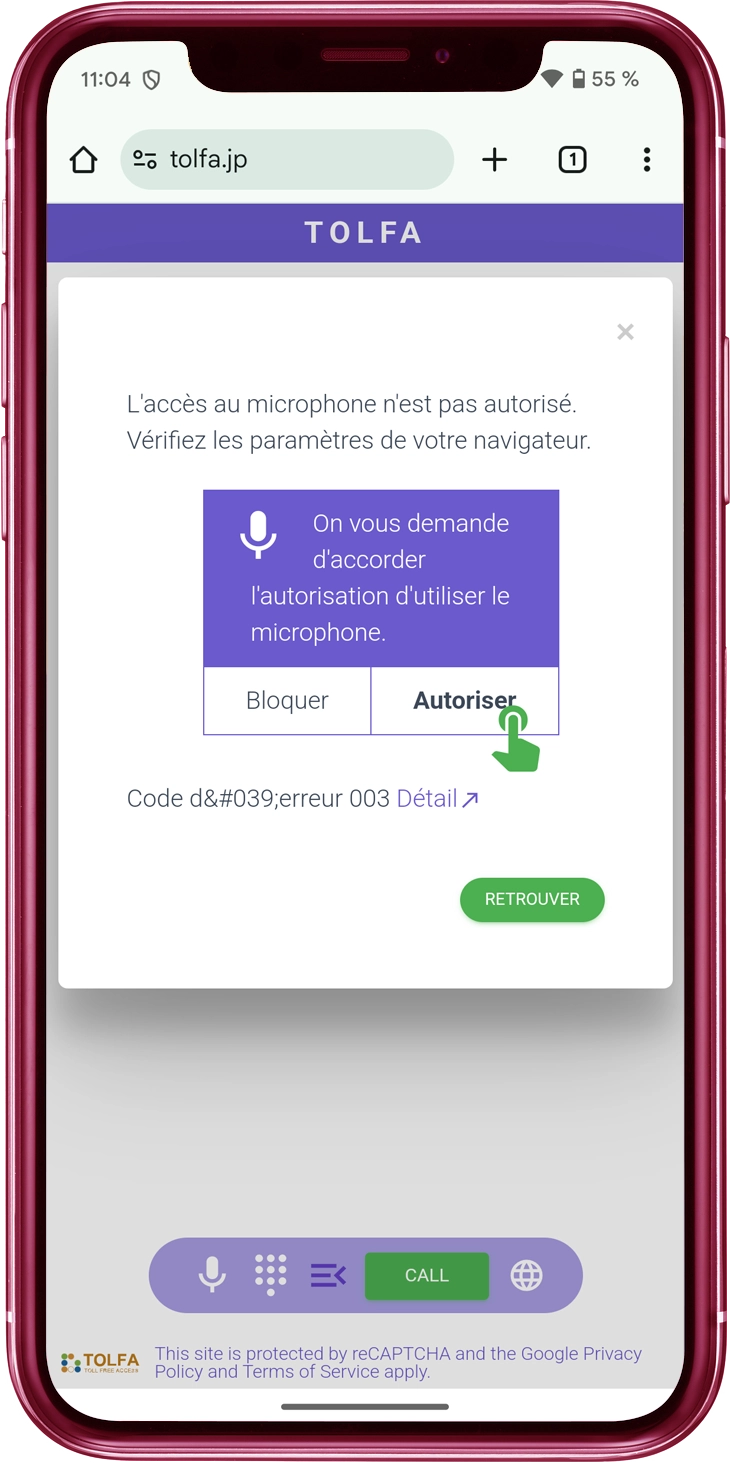 Après avoir appuyé sur le bouton APPELER, si un dialogue apparaît demandant l'autorisation d'utiliser le microphone dans le navigateur, veuillez appuyer sur « Autoriser ». Si l'accès au microphone n'est pas autorisé dans le navigateur, vous ne pourrez pas passer l'appel car le microphone nécessaire à l'appel ne sera pas disponible.