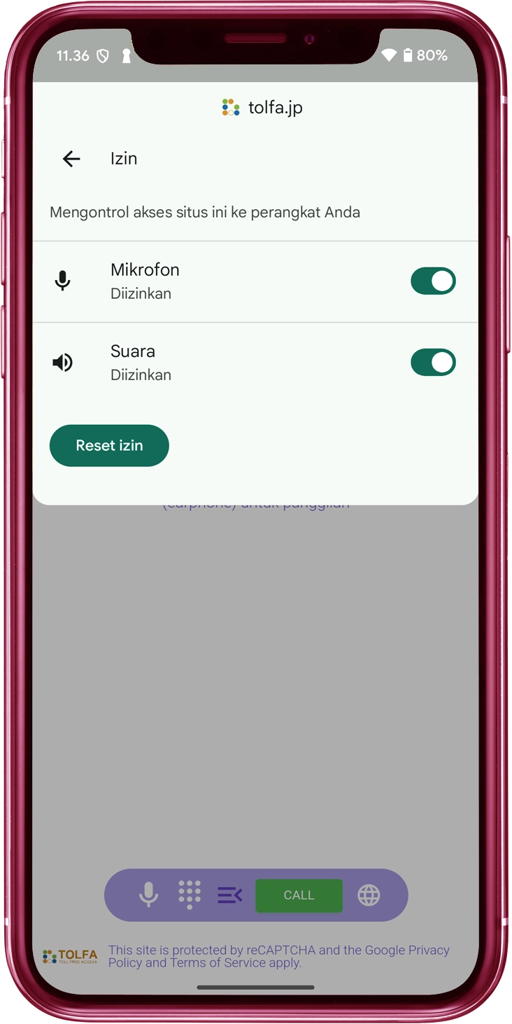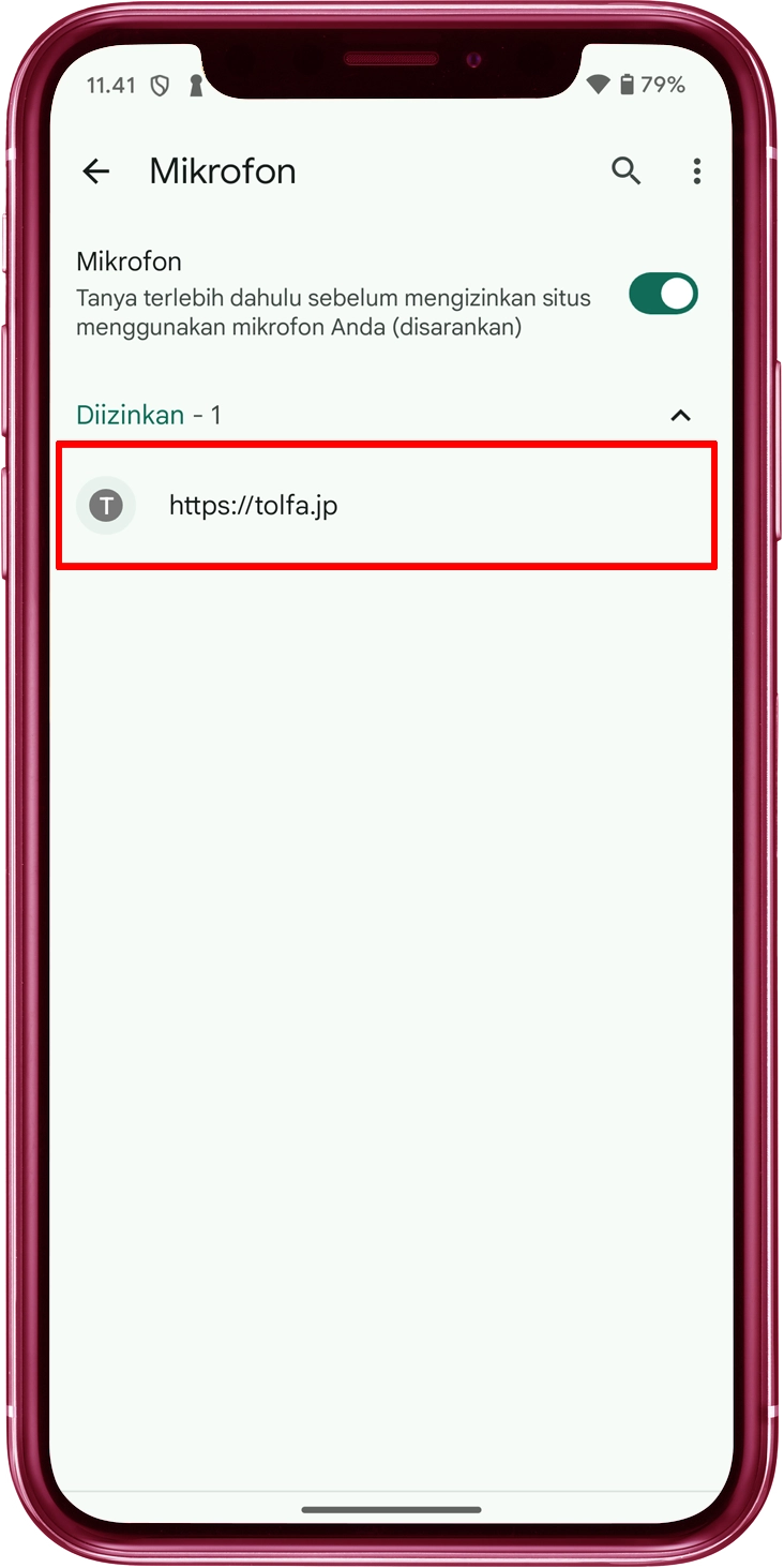 Geser sakelar "Mikrofon" ke posisi ON. Periksa apakah situs web "tolfa.jp" ada dalam daftar yang diberi label "Diizinkan"