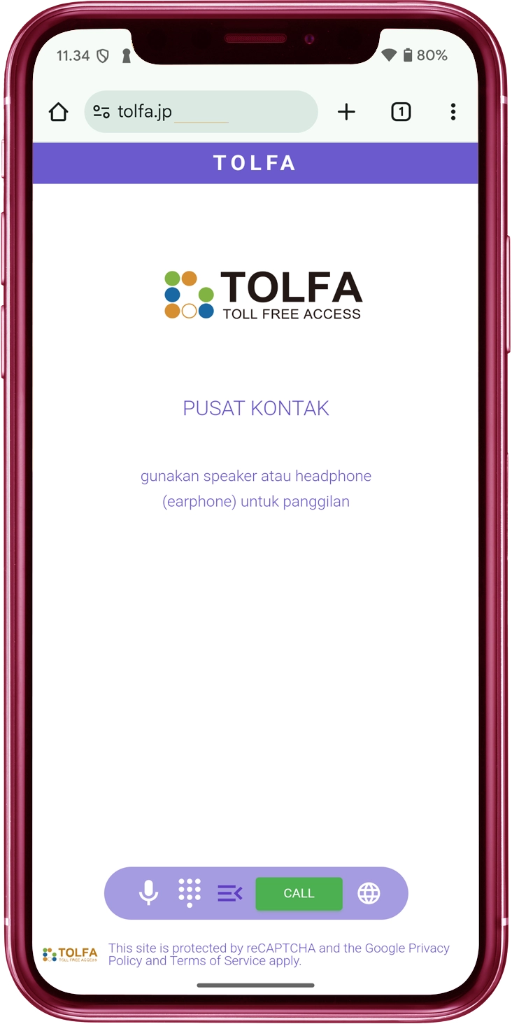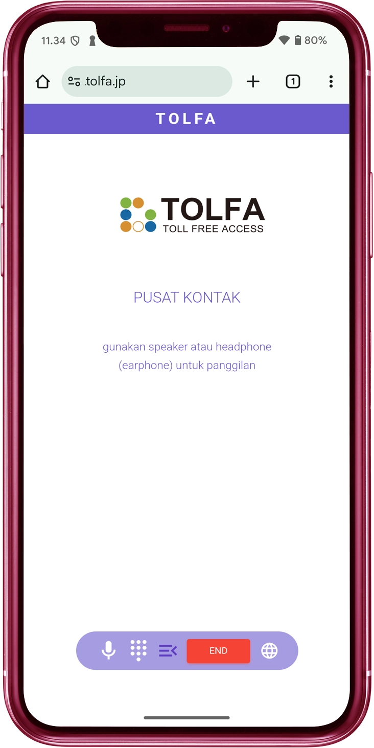 TOLFA adalah layanan yang memungkinkan Anda berbicara langsung dengan voicebot AI atau agen pusat kontak melalui browser di smartphone, tablet, atau PC Anda. Cukup ketuk (atau klik) sebuah tombol di browser untuk memulai percakapan dengan voicebot AI atau agen pusat kontak. Tidak perlu melakukan panggilan dengan cara tradisional — cukup satu ketukan untuk memulai panggilan.
