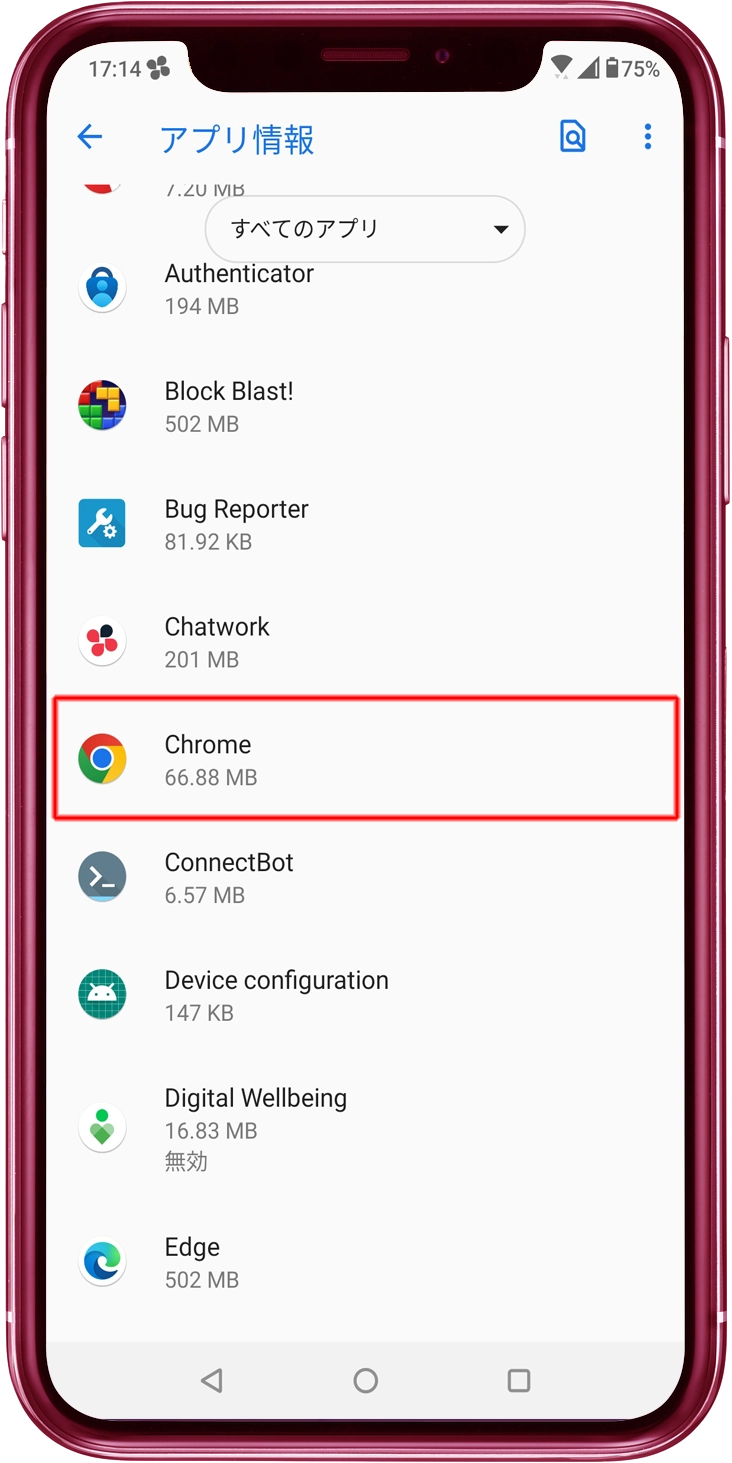 「最近開いたアプリ」「アプリ情報」または「全てのアプリ」の中から、Chromeアイコンをタップします。