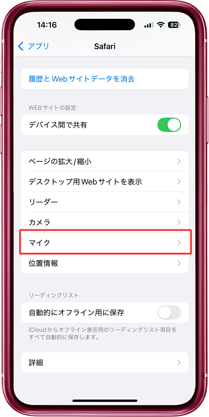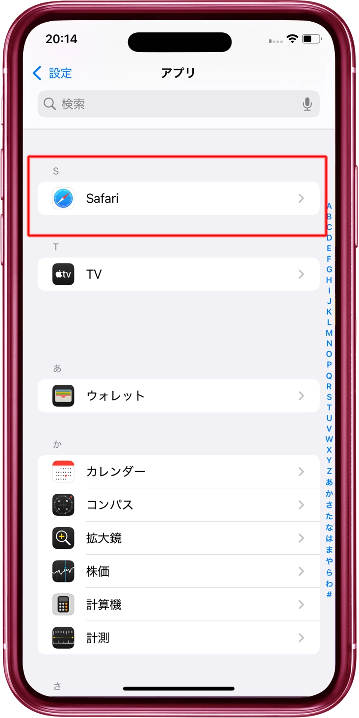 「設定」画面から「アプリ」を開き、「Safari」をタップします。