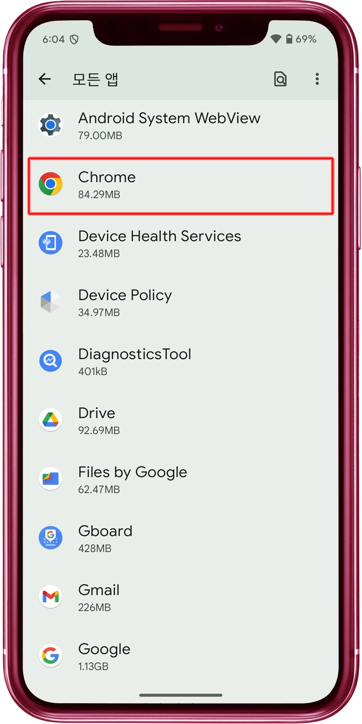 "최근 열린 앱," "앱 정보," 또는 "모든 앱"에서 크롬 아이콘을 탭하세요.