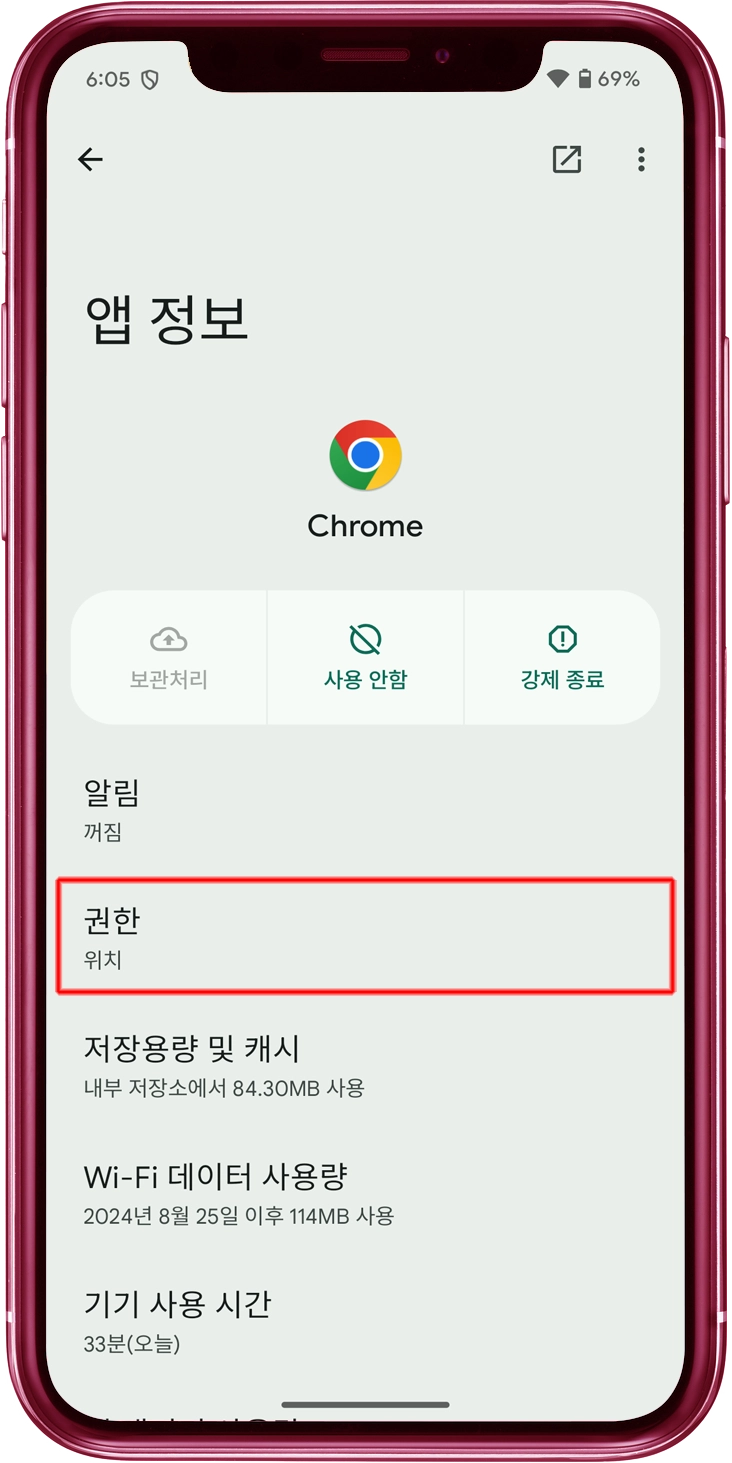 메뉴에서 "권한"을 탭하세요.