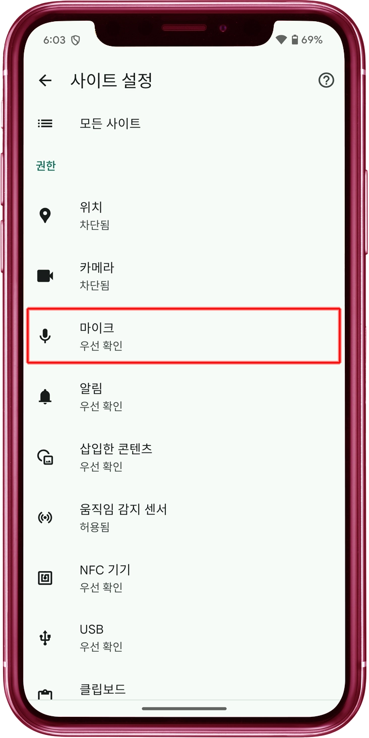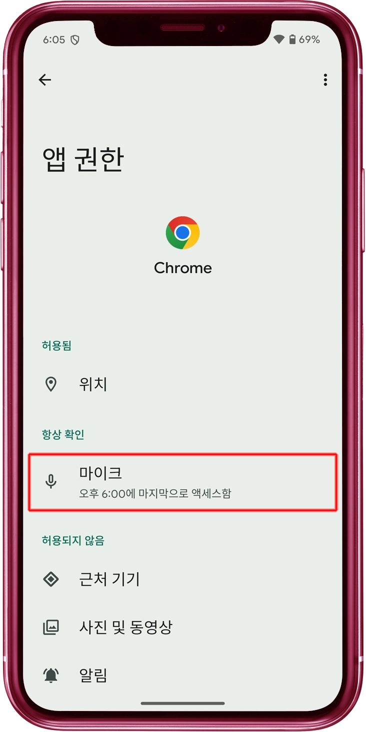 "마이크 권한"에서 "허용" 스위치를 켬으로 전환하세요