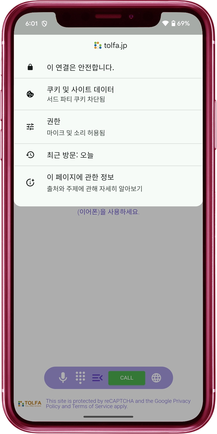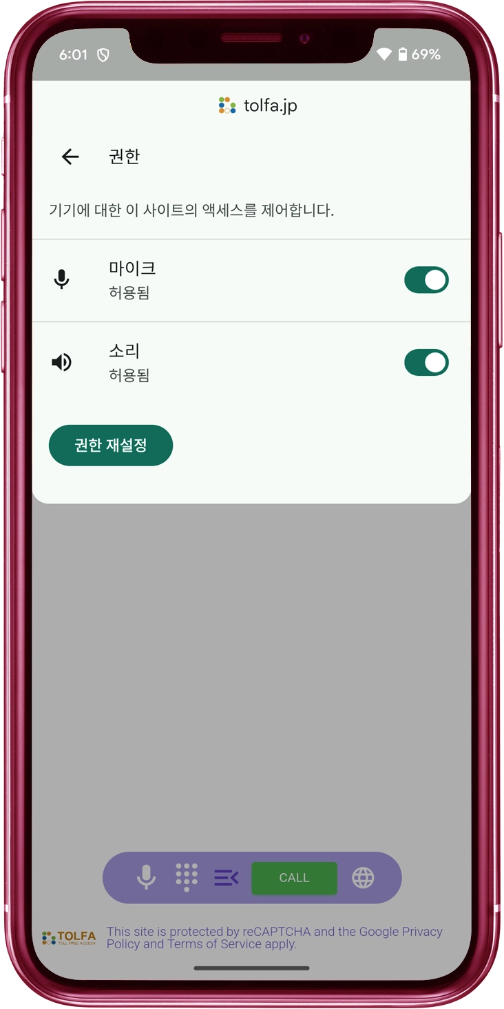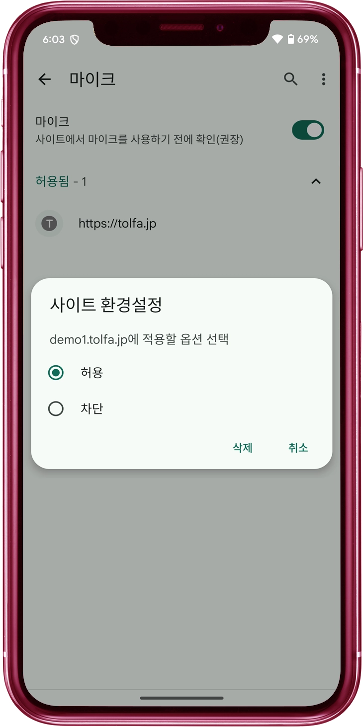 "마이크" 스위치를 켬으로 전환하세요. "tolfa.jp" 웹사이트가 "허용됨" 목록에 포함되어 있는지 확인하세요.