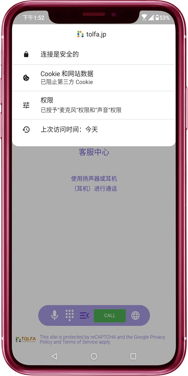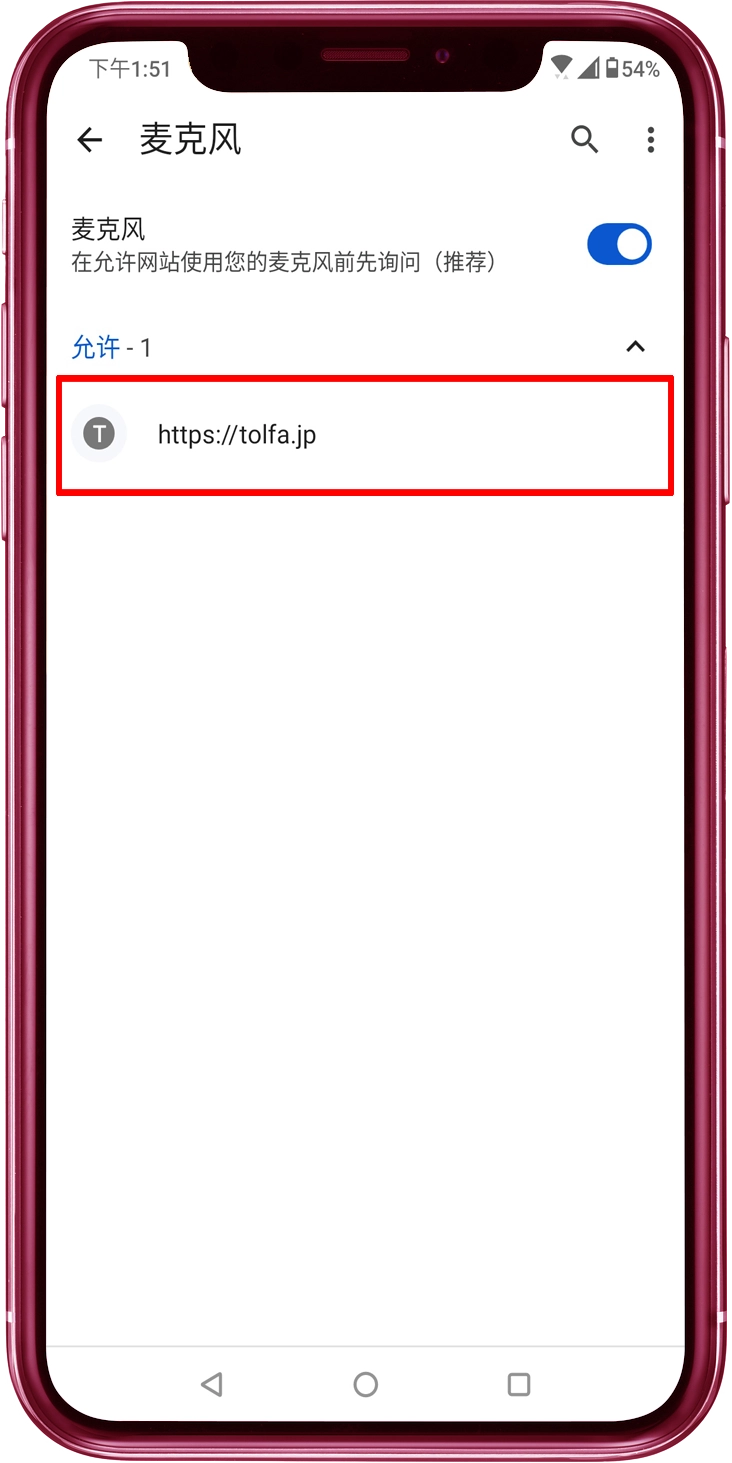 将“麦克风”开关切换为开启状态。确认网站“tolfa.jp”是否包含在标记为“允许”的列表中。